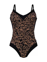Der einteilige Badeanzug MABELA hat keine figurbetonten Nähte und einen kaschierenden Cup. Der paspelierte V-Ausschnitt und die schlankmachenden Paspeln an den Beinen zaubern eine feminine Silhouette. Dieser Badeanzug bietet einen figurschmeichelnden Look.