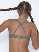 Dieser leicht vorgeformte Mädchen-BH hat einen grünen Streifenaufdruck. Als zusätzliches Detail hat der BH eine süße kleine Schleife zwischen den Cups. Die schlichten Schultergurte sind mit einem Schiebemechanismus verstellbar und können am Rücken mit einem Clip gekreuzt werden.