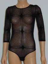 Dieser Körper ist sicherlich einzigartig! Dies ist zum Teil auf den Flockdruck zurückzuführen, der den gesamten Körper bedeckt. Es hat Dreiviertelärmel, die an den Seiten mit Öffnungen versehen sind. Durch sie verläuft eine Schnur, die man unten zusammenbinden kann. Der Korpus wird mit drei Druckknöpfen am Boden geschlossen. Die Rückseite hat einen niedrigeren, abgerundeten Rücken. Kombinieren Sie diesen gewagten Body mit einem BH und einer robusten Jeans.