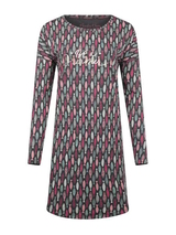 Das Damennachthemd aus weicher Baumwolle aus dem Thema Cold Days trägt sich wunderbar. Es ist dunkelgrau und voller fröhlich bunter Fische und hat einen Foliendruck mit dem Text 'Be a Dreamer'. Dieses Modell bigshirt fällt etwas weiter und kann eventuell mit den Leggings aus diesem Thema kombiniert werden.